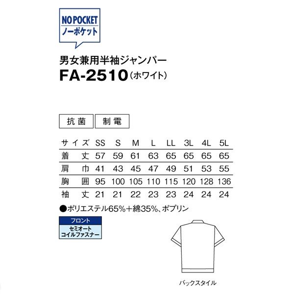 食品用ユニフォーム:常温作業場向け:フレッシュエリア サンペックスイスト/SUNPEXIST FA-2510 食品用白衣/工場用白衣 サンペックスイスト ジャンパー FA-2510 男女兼用半袖ジャンパー ホワイト 抗菌 SS〜4L ポリエステル65%+綿35%、ポプリン ノーポケット 機能:抗菌|制電 特長:フロント:セミオートコイルファスナー フレッシュエリア 常温作業場向け(抗菌素材) 洗濯を繰り返しても効果が持続する強力な抗菌効果で清潔な状態をキープ 生地混率:ポリエステル65%+綿35% 機能:抗菌|制電