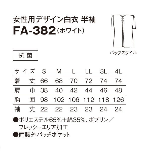 FA-382 女性用デザイン白衣 半袖 ホワイト S〜4L サンペックスイスト 料理衣 調理衣 白衣 素材:ポリエステル65%+綿35% ポプリン フレッシュエリア加工 機能:抗菌 特長:両腰外パッチポケット 日本の伝統「和食」にぴったりな白衣!寿司屋、うどん屋、ラーメン屋、割烹、小料理屋、料亭など、日本料理、郷土料理、京料理、精進料理、海鮮料理など和を扱うお店にぴったりな白衣・調理衣・料理衣を格安・激安でご提供。