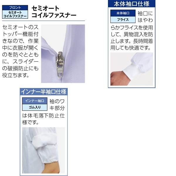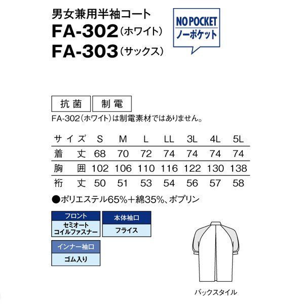 食品用ユニフォーム:常温作業場向け:フレッシュエリア サンペックスイスト/SUNPEXIST FA-303 食品用白衣/工場用白衣 サンペックスイスト コート FA-303 男女兼用半袖コート サックス 5L 大きいサイズ ポリエステル65%+綿35%、ポプリン ノーポケット 機能:抗菌|制電 特長:フロント:セミオートコイルファスナー|本体袖口:ゴム入り|インナー袖口:ゴム入り フレッシュエリア 常温作業場向け(抗菌素材) 洗濯を繰り返しても効果が持続する強力な抗菌効果で清潔な状態をキープ 生地混率:ポリエステル65%+綿35% 機能:抗菌|制電 給食サービス 学校などの調理現場の衛生管理を安全で快適にサポートするアイテム 病院/福祉施設/社員食堂/学校の方向き 生地混率:ポリエステル65%+綿35% 機能:抗菌|制電