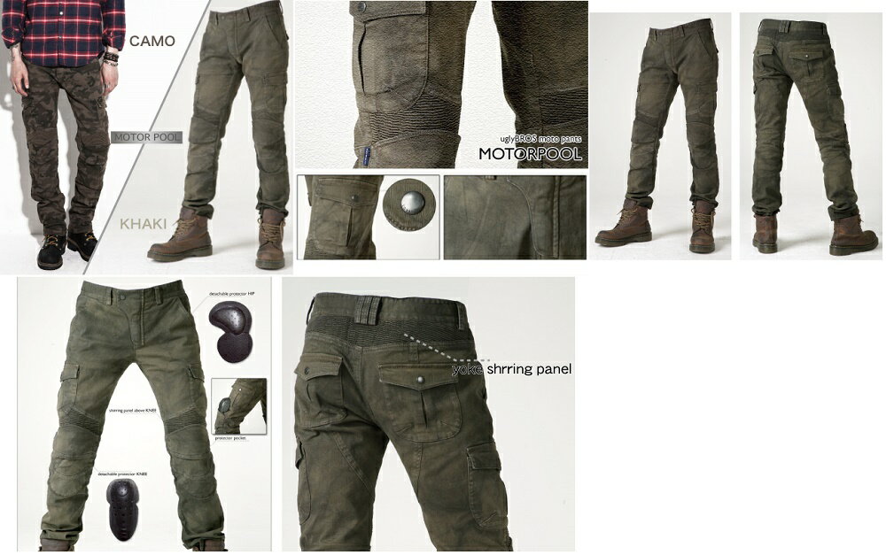 スタイリッシュなライディングカーゴデニムカーキ、カモフラの二色設定ストレッチデニムを使ったフィッティングで履きやすさ抜群腰と膝上のシャーリングパーツで屈曲追従性能をアップ高規格CEパッドを膝と腰に採用 膝は外入れ式で簡単脱着可能ニーパッドは屈曲性が高くライディングフォームを妨げませんスナップボタン付きフラップポケットを4箇所備えたカーゴスタイルシルエット:スリムストレートフィットMATERIAL:cotton 97%、elastine 3%【商品名】UB0004 モトパンツ MOTORPOOL メンズジーンズ カーキ 34インチ【商品番号】U13-UB0004KK4【メーカー】uglyBROS(アグリブロス)【サイズ】34インチ